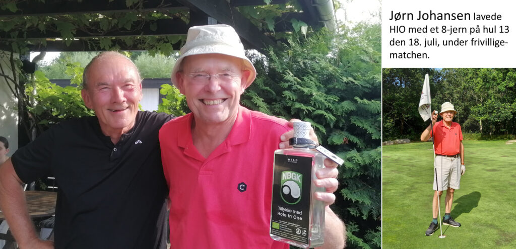 Mandag den 10. juli slog Philip Hansen (til højre) fra Simons Golfklub et flot slag på 13 med sit 8-jern og bolden gik lige i hul. Det var i en privatrunde med Uffe Pedersen fra Gudhjem GK. Stort tillykke fra NBGK.